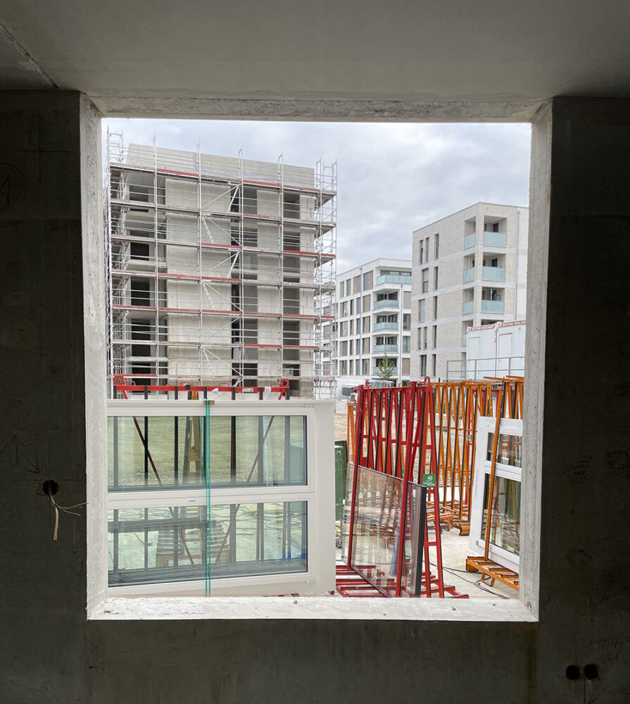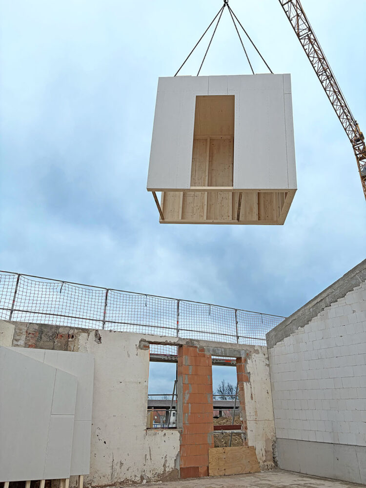 Derzeit werden die vorgefertigten Sanitärmodule aufgestellt. Parallel dazu schreitet auch die Fassadensanierung voran: Die elementierten, vorgefertigten Fassadenelemente werden montiert und die Dachelemente angeliefert.