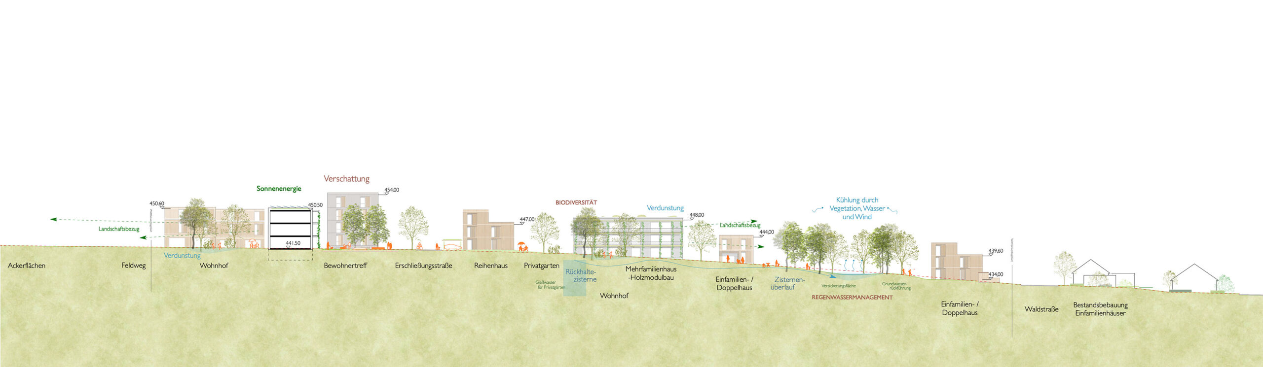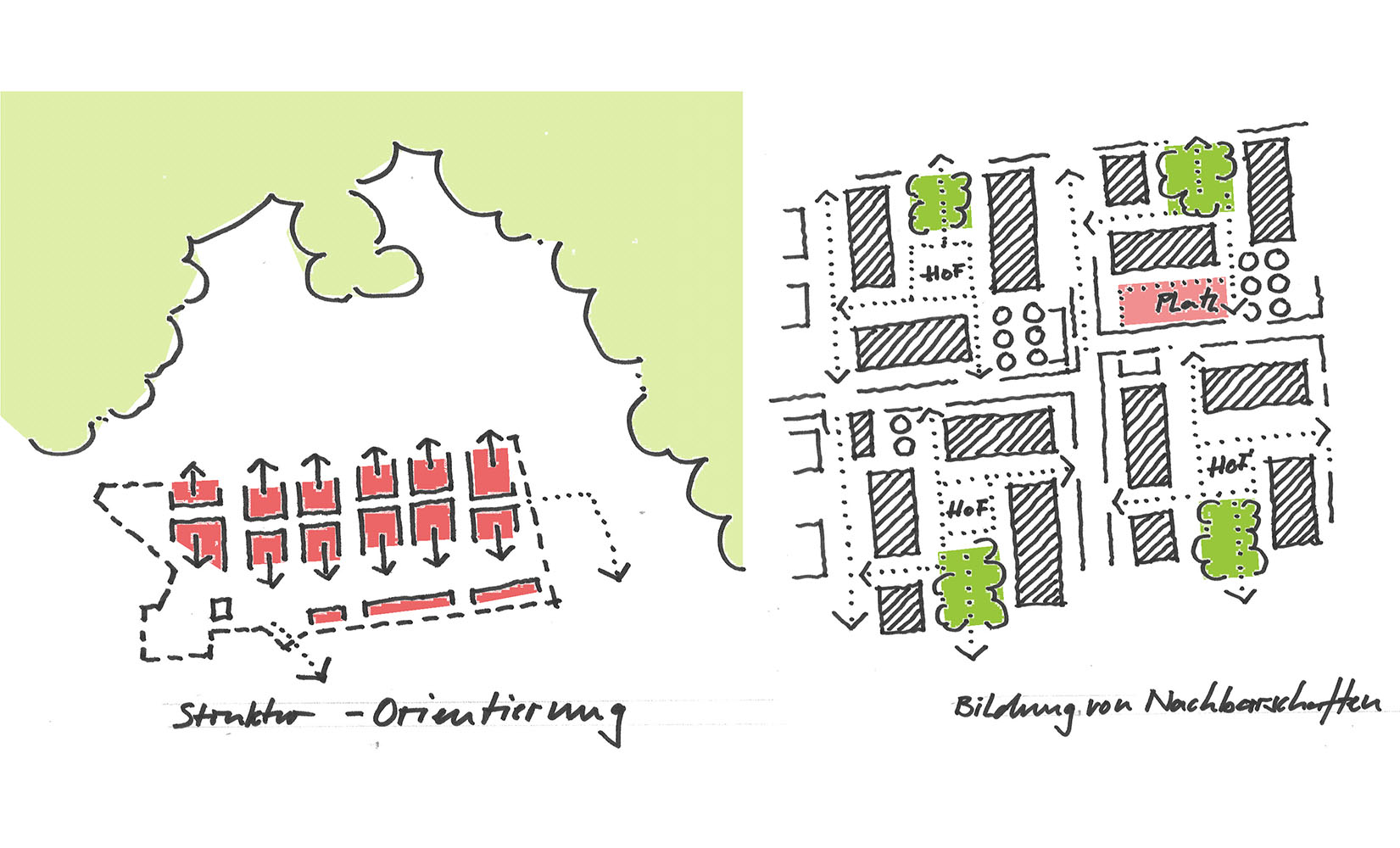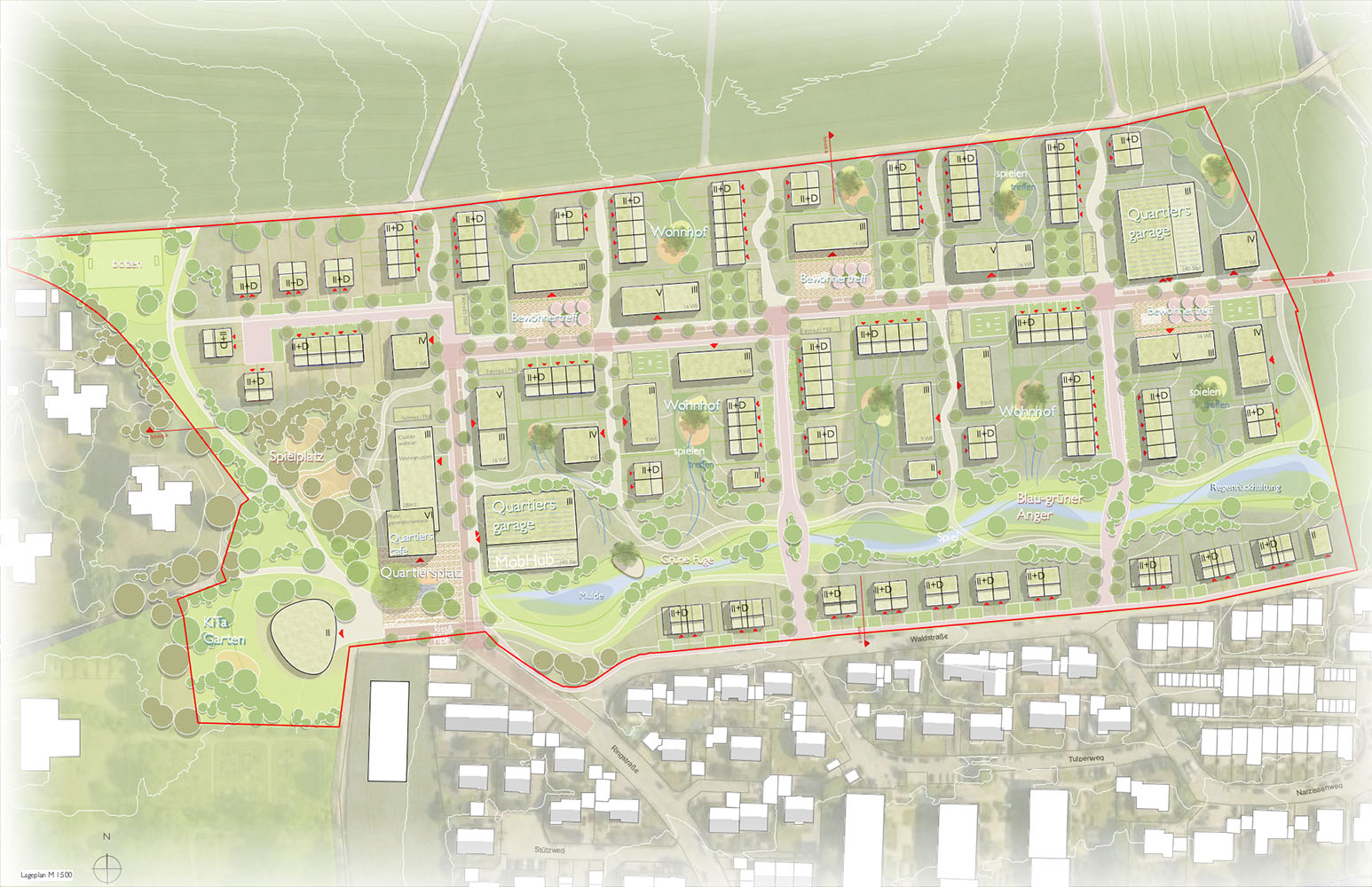 Preisgericht: Die vorgeschlagene Siedlungsstruktur beruht auf einem stabilen, nachvollziehbaren städtebaulichen Gerüst mit zwei großen zentralen Baufeldern und unterschiedlichen Strukturen an den Siedlungsrändern. Über die gesamte Struktur hinweg werden an einzelnen Orten akzentuierende höhere Punkte entwickelt, was zu einer guten Orientierung im Quartier beiträgt.